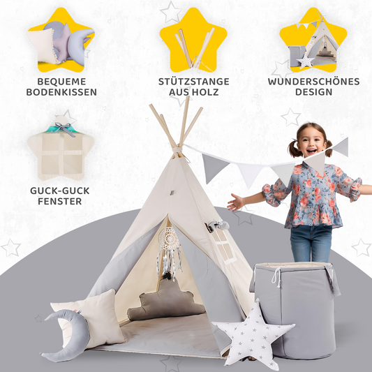 Tipi Spielzelt Grauer Stern | Kinderzelt mit Sternenmuster – Rainbow Kids