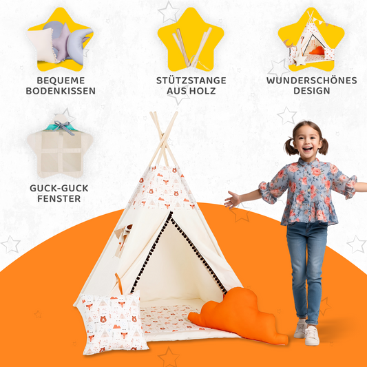 Tipi Spielzelt Fuchsi & Bärchen | Kinderzelt mit Tiermotiven – Rainbow Kids